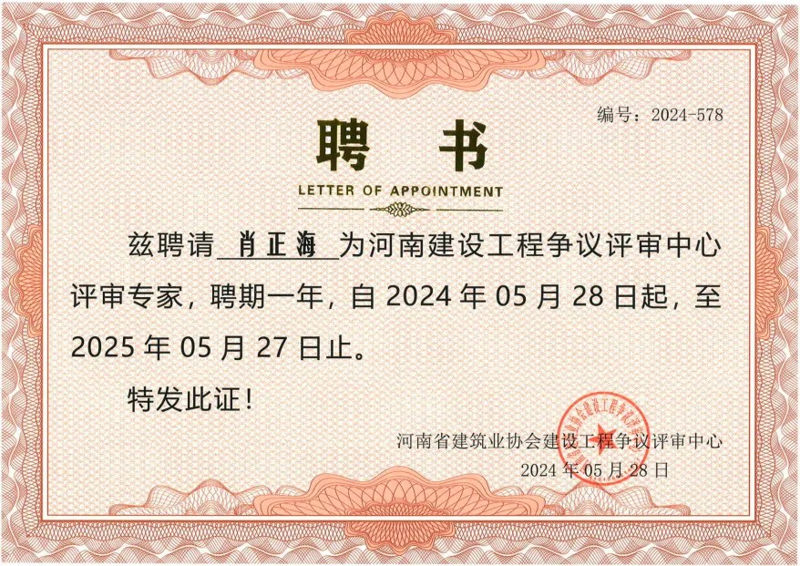 肖正海律师从事法律工作至今已20余年,执业期间,办理过多起重大疑难民商、刑事、经济、行政诉讼及非诉讼案件,积累了丰富的理论和实践经验。今后,肖正海律师将立足行业法律服务,充分发挥评审专家的专业职能,更好地服务于广大建设工程企业和从业人员,为推动河南省建设工程行业的健康发展做出积极贡献。