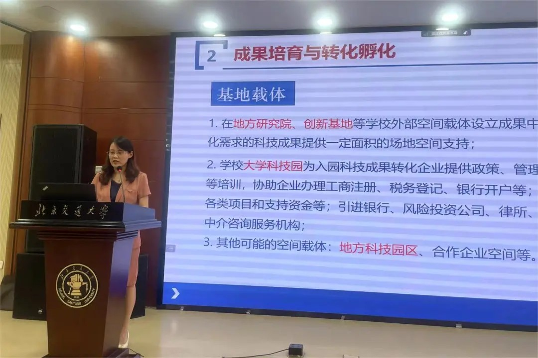 王欣老师以“促进科技成果转化政策宣讲”为主题进行分享。在分享中,王老师结合北京交通大学在知识产权保护和技术转化方面的工作,从成果转化工作情况、促进成果转化政策等方面进行了详细分享与介绍。王老师谈到,建设专业化人员团队、引入优质社会资源、紧密联系科研平台团队、加强培育孵化及落地服务等多项举措,能够更好服务高校老师科技成果转移转化。