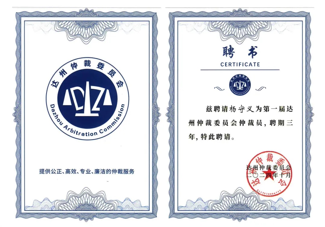 高文律师具有丰富的仲裁经验,多位律师受聘于全国各省市仲裁委员会。此次获聘,充分体现了达州仲裁委员会对杨守义律师职业素养与专业沉淀的肯定,也是高文稳健发展专业化建设的成果。