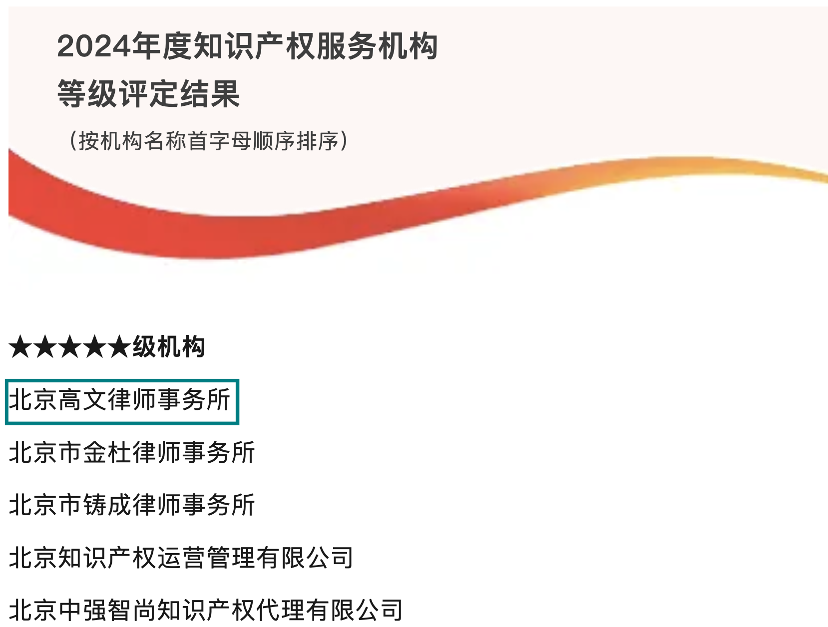 11月5日,首都知识产权服务业协会公布《2024年度知识产权服务机构等级评定结果》。在本次评选中,高文律师事务所凭借卓越的专业表现被评为五星级知识产权服务机构,较2023年度实现了等级攀升。