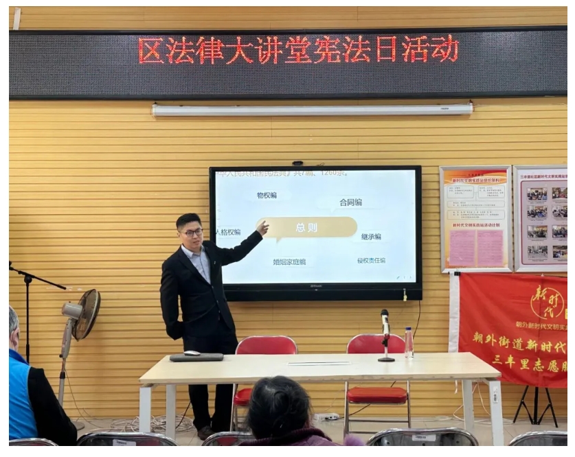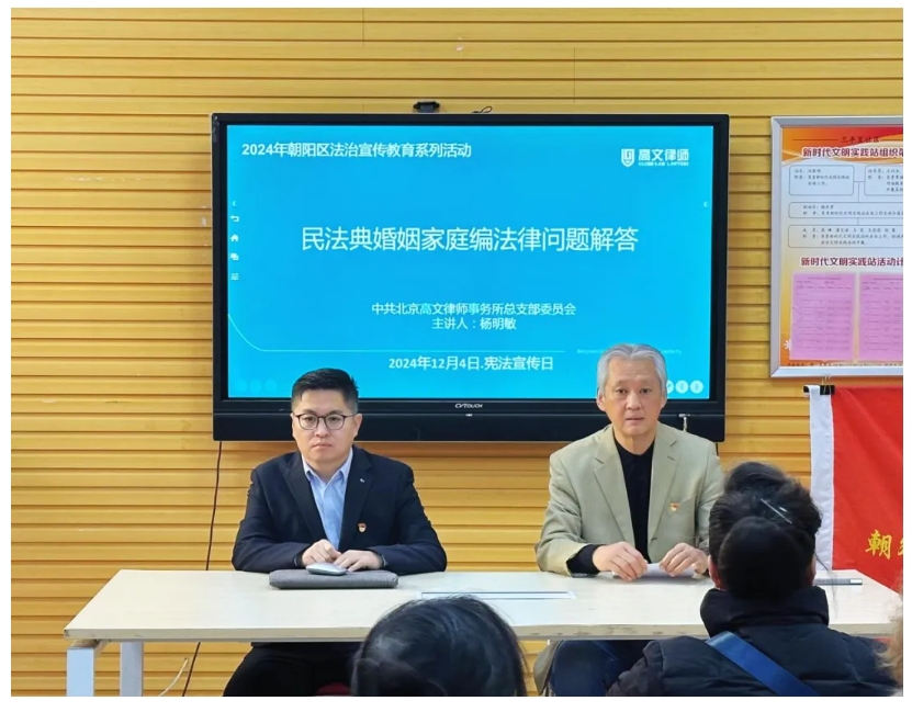12月4日,高文党总支积极组织开展“宪法+公益 普法面对面”活动,党总支副书记孙如岐、第四支部书记杨明敏、党务专员王晨深入朝阳区三丰里社区,向辖区居民广泛宣传《宪法》及《民法典》法律知识。