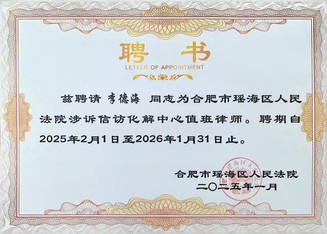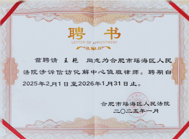 高文合肥办公室王艳律师、李德海律师、刘培芳律师经合肥市律师协会推荐、选聘,入驻涉诉信访化解中心担任调解律师,聘期一年。