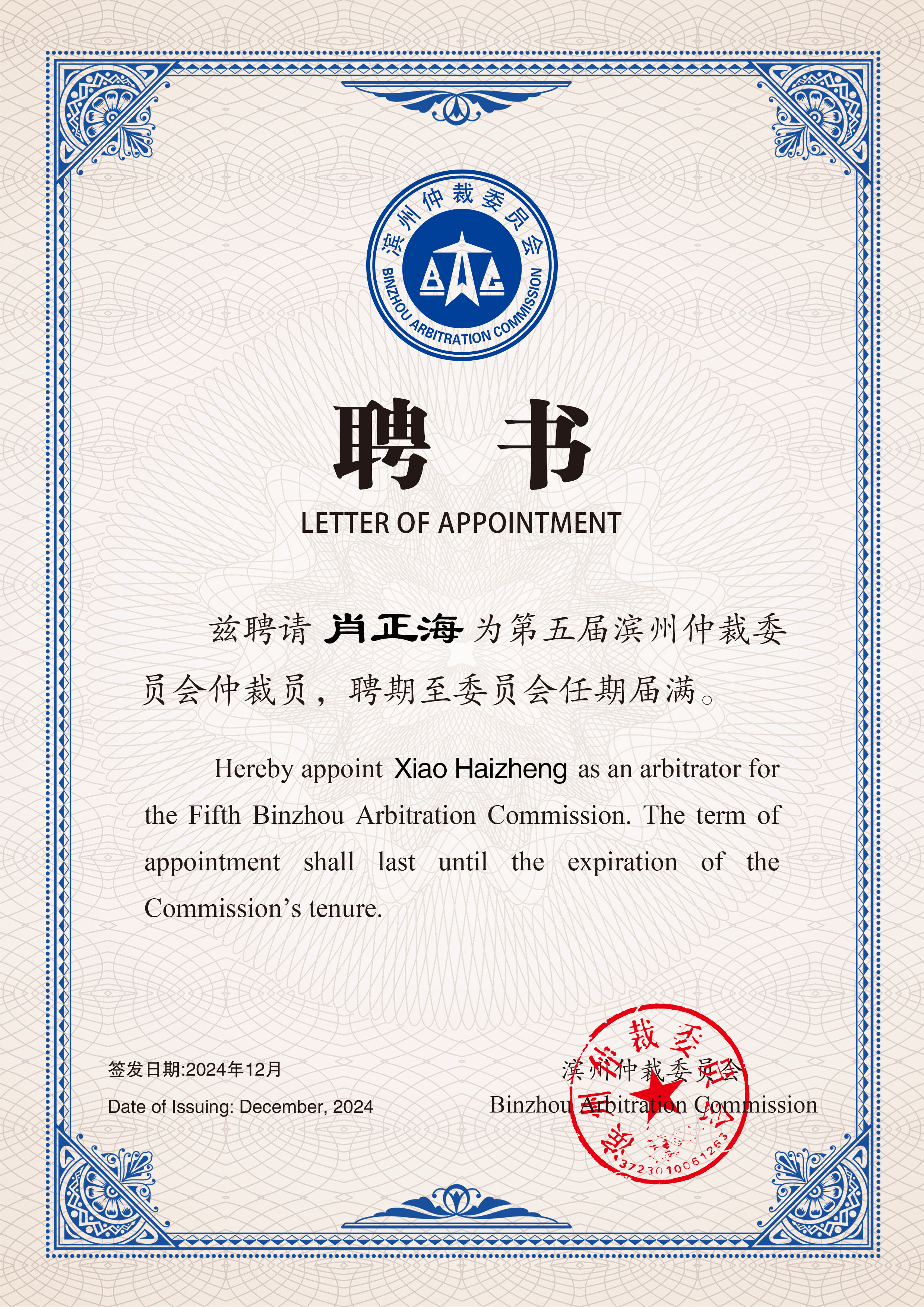 近日,高文郑州办公室合伙人肖正海律师,支学雷律师凭借卓越的专业素养和丰富的法律实践经验,被聘任为第五届滨州仲裁委员会仲裁员。