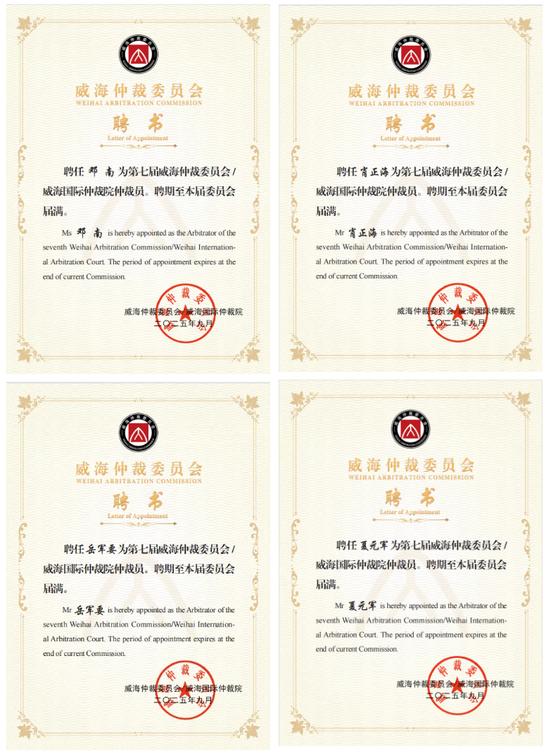 2025年9月18日,经第七届威海仲裁委员会第一次会议审议通过,高文律师事务所合伙人邓南律师(续聘)、肖正海律师、岳军要律师,夏元军律师凭借其专业实力和丰富的执业经验,获聘第七届威海仲裁委员会/威海国际仲裁院仲裁员,聘期至本届委员会届满。