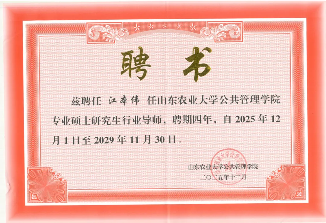 近日,高文律师事务所合伙人江本伟律师正式获聘为山东农业大学公共管理学院专业硕士研究生行业导师,聘期4年。