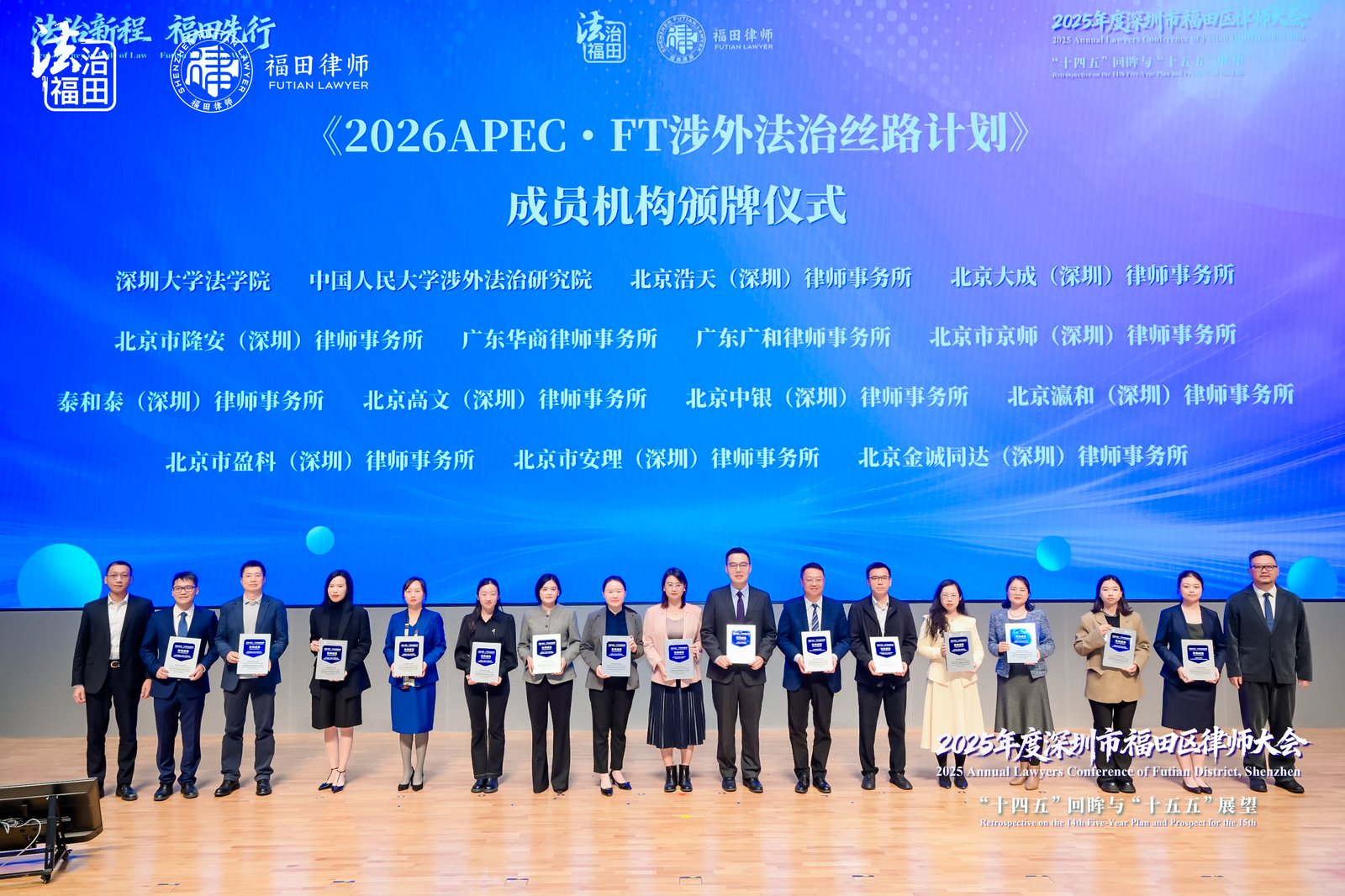 2025年12月19日下午,由深圳市福田区司法局、中共深圳市福田区律师行业党委、深圳市律师协会福田区律师工作委员会协办的“法治新程•福田先行——十四五回眸与十五五展望”2025年度福田区律师大会圆满举行。